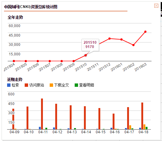 單庫趨勢圖在生成時(shí)需要先在左側資源庫列表中選定某資源庫。因為是趨勢統計,所以這里沒(méi)有的時(shí)間范圍設置缺少按日排名和按月排名。支持按日確定時(shí)間段,也可以按月確定時(shí)間段。需要注意的是,這里的按日或按月都是以選擇的時(shí)間為一個(gè)單位,每個(gè)單位就是趨勢圖中的一個(gè)點(diǎn)。因為電腦屏幕的寬度有限,所以請選擇天數或者月份數時(shí)不要太多,具體可以在生成圖表時(shí)進(jìn)行體驗,盡量使圖表即美觀(guān),又能滿(mǎn)足您的時(shí)間范圍需求。一般來(lái)說(shuō),使用按月份統計的情況會(huì )更多一些。