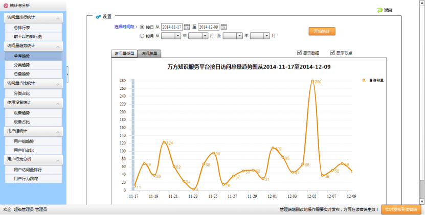 例如,我們選擇萬(wàn)方學(xué)術(shù)期刊數據庫按日的趨勢圖:按日選擇時(shí)間段為2014-11-17到2014-12-09(如下圖)。