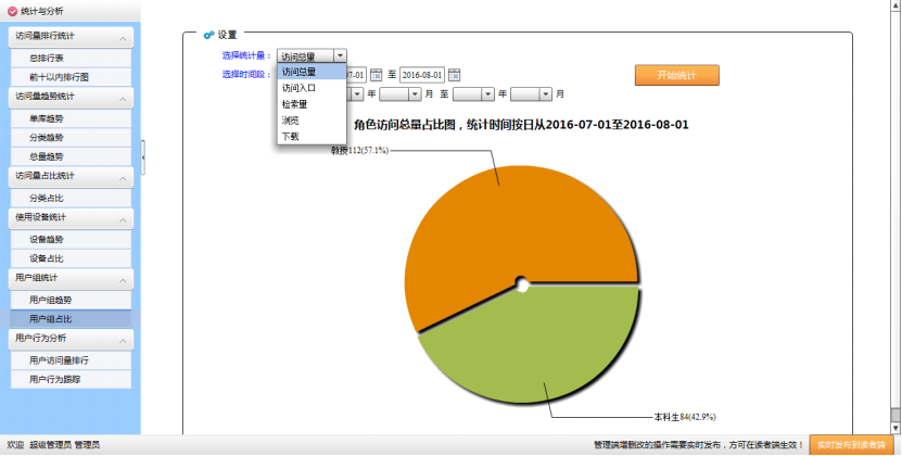 點(diǎn)擊菜單【統計與分析>>用戶(hù)組統計>>用戶(hù)組占比】,打開(kāi)用戶(hù)組占比圖的設置頁(yè)面。查看不同用戶(hù)角色訪(fǎng)問(wèn)量的占比時(shí),選擇相應的時(shí)間段即可統計,默認統計數據為訪(fǎng)問(wèn)總量,可以切換不同的訪(fǎng)問(wèn)類(lèi)型了解不同的讀者針對不同的行為占比情況(如下圖)。